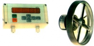 PM9000 meter counter has been designed for accurate length measuring. It consists of a control unit TERM20 and measuring wheel with revelation transducer. The TERM20 control unit is based on a processor module that counts and displays the current count of measured meters and is able to control two adjustable meter count limits. There is a relay for each limit that disconnects the controlling contact when the given limit has been exceeded. The necessary information is displayed on an 8-digit seven-segment LED display with a digit size of 14 mm. The counter is operated with a membrane keyboard. The measuring range is from 0 to 99999.9 m with 0.005 m increments. The operator can operate the counter using the membrane keyboard and menu showing on the display. A given menu is characterized with the first symbol on the display. The menu can be changed by pressing the 'up" or 'down' keys. The following are basic menu: display the current meter status, reset, display Limit 1 (Low), display Limit 2 (High), access the service menu. The editing is always confirmed by pressing the ENTER key. Digits are selected by pressing the direction keys of 'left' and 'right', their values can be changed by pressing the 'up' and 'down' keys. The counter is controlled by a PIC processor with a lithium battery backup. Important parameters are stored in a serial EEPROM memory. The counter is powered with a voltage between 12 and 30 V DC. Basic technical data on the control unit: